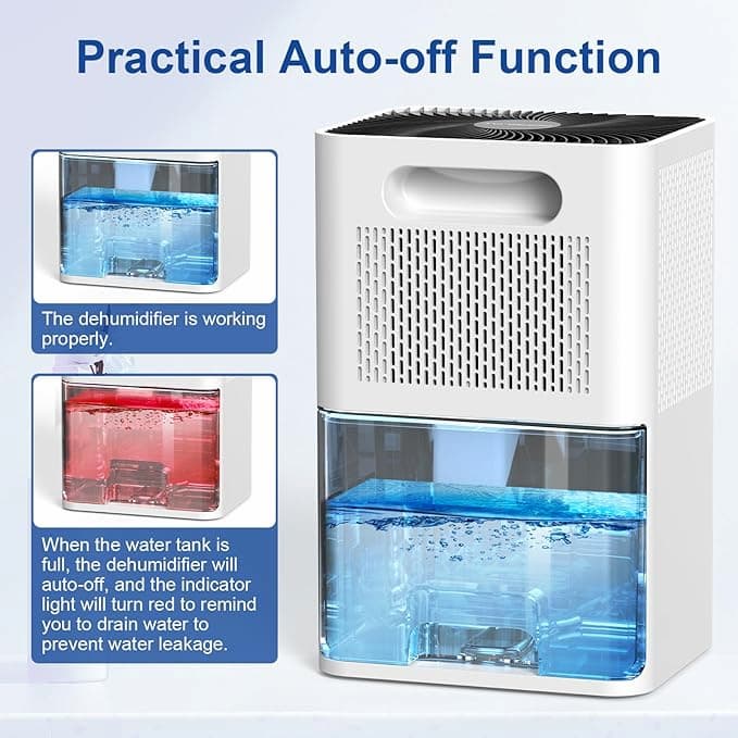 【عملکرد خاموش شدن خودکار و زمان‌بندی】 این رطوبت‌گیر مجهز به یک مخزن آب قابل مشاهده با ظرفیت ۱.۸ لیتر (۶۰ اونس) است که وقتی مخزن آب پر شود، رطوبت‌گیر قابل حمل به طور خودکار خاموش می‌شود و چراغ نشانگر قرمز می‌شود تا به شما یادآوری کند که آب را عوض کنید. همچنین می‌توانید زمان تایمر را روی ۶/۸/۱۰ ساعت تنظیم کنید و با اتمام زمان، به طور خودکار متوقف می‌شود.